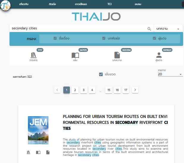 ข้อมูลเมืองรอง thaijo มืองรอง ในบริบทด้านการท่องเที่ยว (Secondary cities หรือ Less visited area) ได้รับความสนใจในการพัฒนาเศรษฐกิจด้วยการท่องเที่ยวของจังหวัดต่าง ๆ และได้รับการสนับสนุนจากรัฐบาลอย่างต่อเนื่อง เมื่อสืบค้นบนฐานข้อมูล Thaijo พบว่า มีบทความในฐานข้อมูลมีมากถึง 322 รายการ (สืบค้น 2 ก.ย.68) ที่สามารถนำมาทบทวนวรรณกรรม ศึกษาแนวทางการพัฒนา นำข้อเสนอแนะมาปรับใช้ หรือเป็นข้อมูลในการศึกษาต่อยอดในพื้นที่อื่น และจังหวัดที่มีบริบทที่ใกล้เคียงกันต่อไป